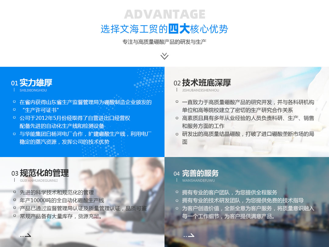 硼酸厂家:淄博文海工贸有限公司主营各种工业硼酸,公司成立于2006年2月,位于山东省淄博市博山区。公司占地面积10000m²,拥有职工60人,技术人员5人;公司资金技术实力雄厚,配备先进的自动化生产线和检测设备,更有一批高素质且具有多年从业经验的人员负责科研、生产、销售和服务方面的工作。...